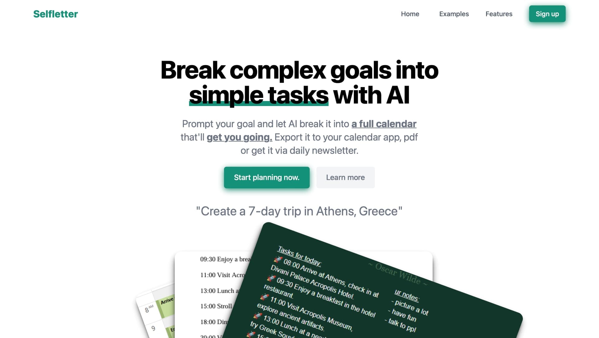 Selfletter er en ny tjeneste, der bruger kunstig intelligens til at hjælpe folk med at nå deres mål. Ideen er simpel: Du fortæller AI'en om dit mål, og den laver derefter en detaljeret kalender med små, overskuelige opgaver, der fører dig mod dit mål.