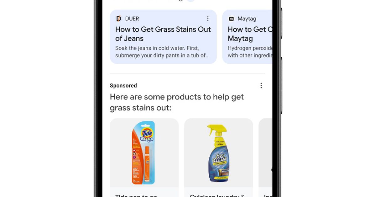 For eksempel, hvis man søger efter måder at fjerne græspletter fra tøj, vil AI-resuméet give tips sammen med forslag til relevante produkter at købe. Disse produkter vil blive vist under en "sponsoreret" overskrift og vil kun dukke op, hvis søgningen har en kommerciel vinkel.