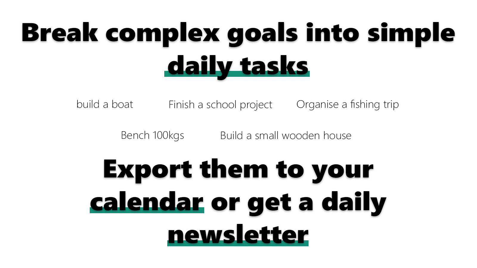 Tjenesten kan bruges til alle slags mål, hvad enten det er rejseplanlægning, fitness eller forretning. Den skaber en personlig plan baseret på dine input og kan tilpasses dine behov. Du kan eksportere dine opgaver til PDF eller din kalenderapp, eller få dem tilsendt som et dagligt nyhedsbrev.