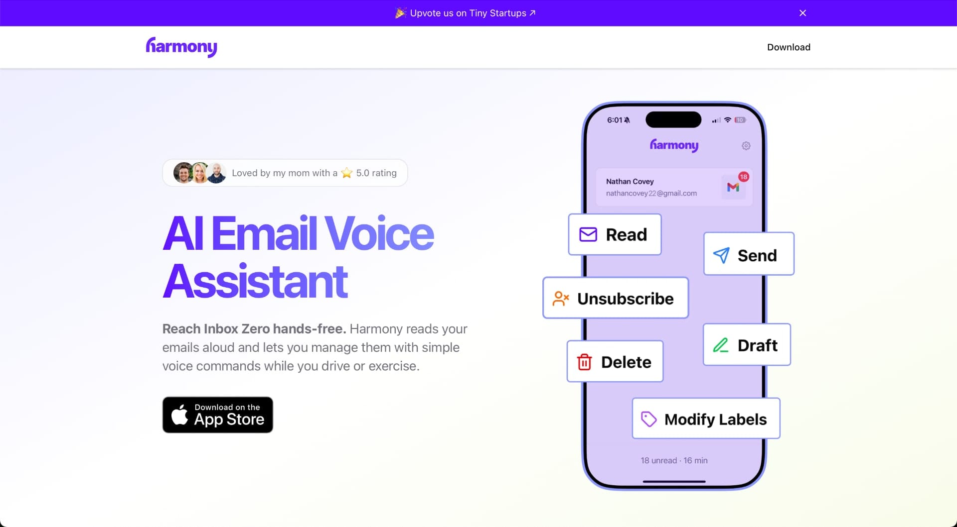 Harmony understøtter for nuværende Gmail, med planer om at tilføje Outlook og andre udbydere senere. Du kan bede assistenten om at læse, sende, oprette kladder, slette emails, ændre labels og endda afmelde dig nyhedsbreve - alt sammen ved hjælp af din stemme.
